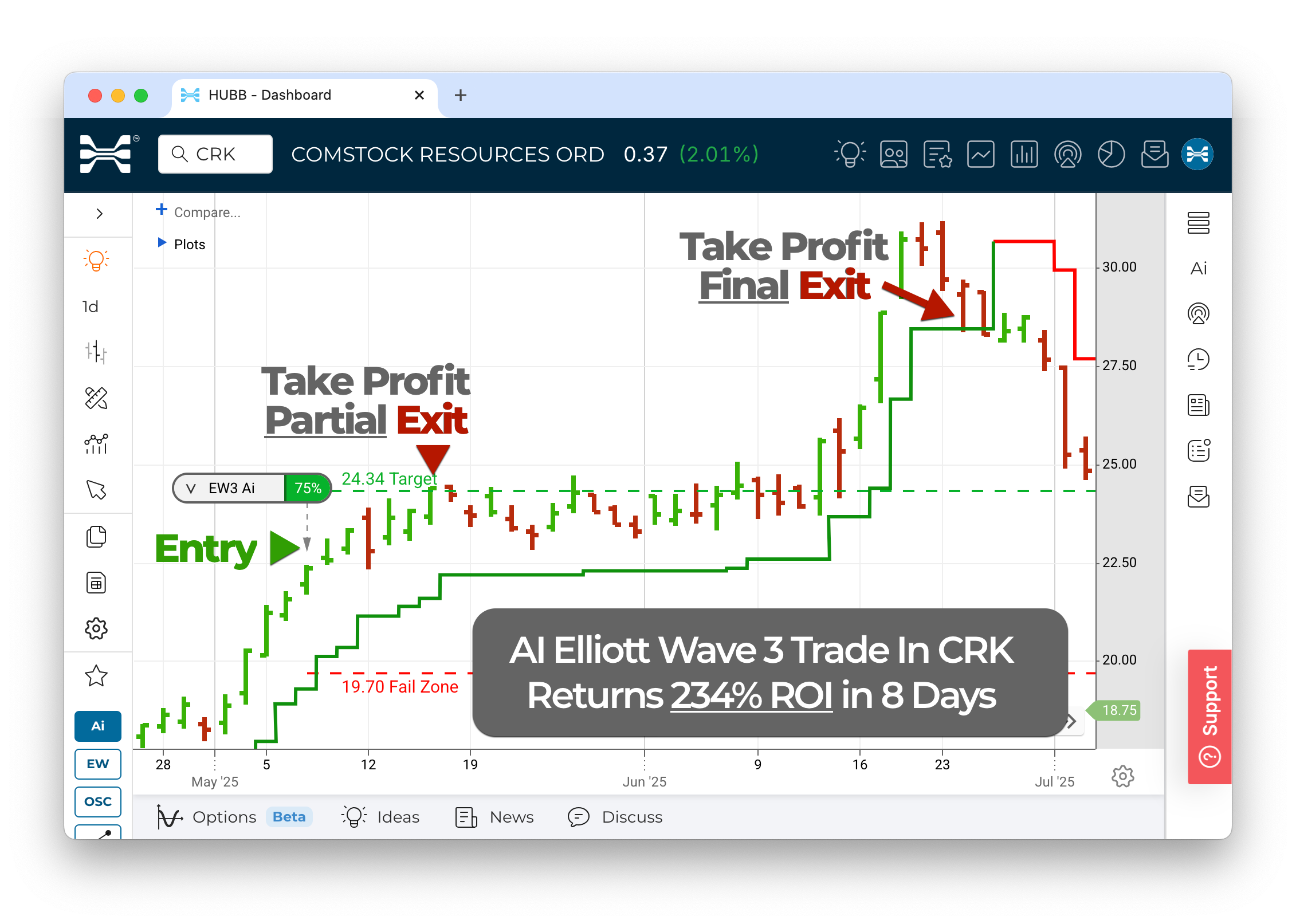 Every HUBB AI trade follows clear rules. We only enter when the confidence score is above 75, giving us higher-probability setups. At the AI target, we take some profit, then use a trailing stop to protect gains and stay in if the stock keeps rising. This Comstock Resources (CRK) trade shows the process in action: